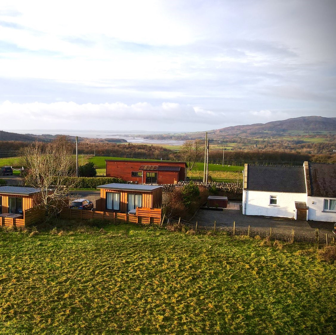 Galloway View is a collection of luxury holiday properties, incorporating three mini lodges sleeping two people, three two bedroom lodges, each sleeping four people, and a cottage which sleeps six. The properties are located on the family farm; with incredible views of the rolling countryside, Galloway hills and out to sea.